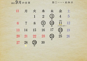 2015年9月の営業予定表です。 9月からは展示会等が多数あり、 予期せぬ変更もあるかもです。 その際は速やかにコチラのブログ、SNSにてお知らせ致し… Read More »